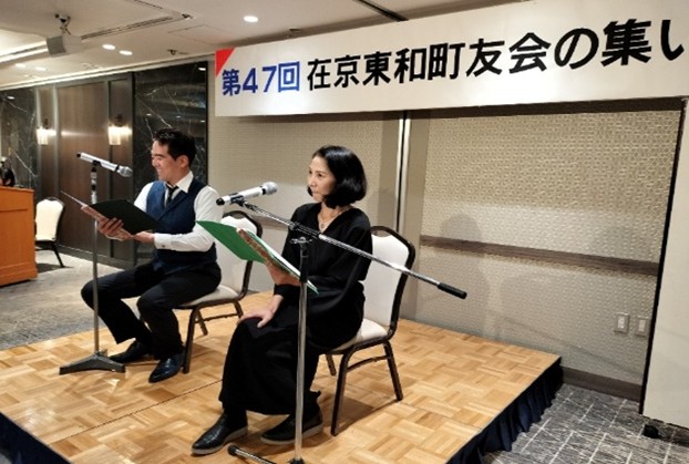 翌日の9日(日)には、「在京東和町友会の集い」があり、総会の後、親睦交流会が行われました。来賓の挨拶、乾杯の後アトラクションでは、ものがたりグループ「ポランの会」の二人による宮沢賢治の「注文の多い料理店」朗読の発表がありました。とても息の合った素晴らしい朗読で宴会の途中でも堂々と発表する姿はさすがだと思いました。最後は、千昌夫の「北国の春」を皆で歌いお開きとなりました。二次会は同じホテルのバーで行いましたが、東和町から来られた方々とも話が弾み楽しい時間を過ごしました。